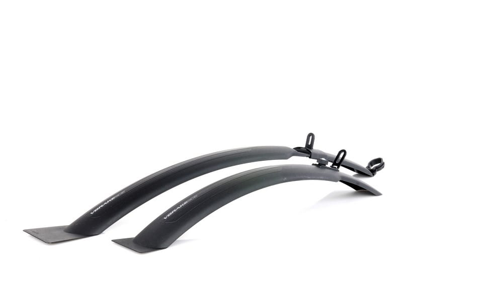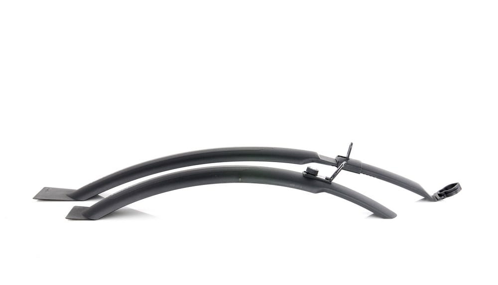 Komplet błotników o nowoczesnym wzornictwie, pasujący do kół 26 i 28 cali o profilu opony do 65 mm. Zoptymalizowane do montażu przy hamulcach V-Brake. Samoczyszczące polerowane strony wewnętrzne. Tył mocowany za pomocą specjalnej przystawki z tworzywa umożliwiającej dużą regulację w pionie i poziomie oraz szybki montaż. Wklęśnięcie w błotniku w miejscu gumki hamulca V-Brake, wysięgnik do ramy z przegięciem i kanałem dla linek przerzutki. Przód mocowany na blaszce z nakrętką z tworzywa dla szybszego montażu.